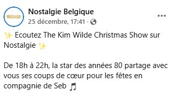 Kim Wilde – Radio Nostalgie Belgique – 25/12/25 Par MiniKim le 29 décembre 2025 dans Kim Wilde en 2025